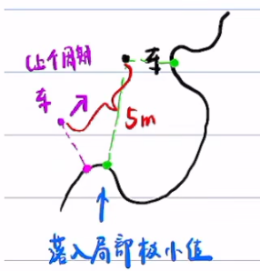 但是这种问题一般情况下不会出现,因为规划周期是100ms,即使以50m/s的速度运动,车也只走了5m,5m内道路不太可能出现这么扭曲的几何,一般在上个规划周期的匹配点上只有一个极值点。